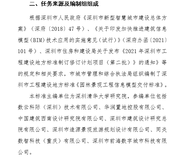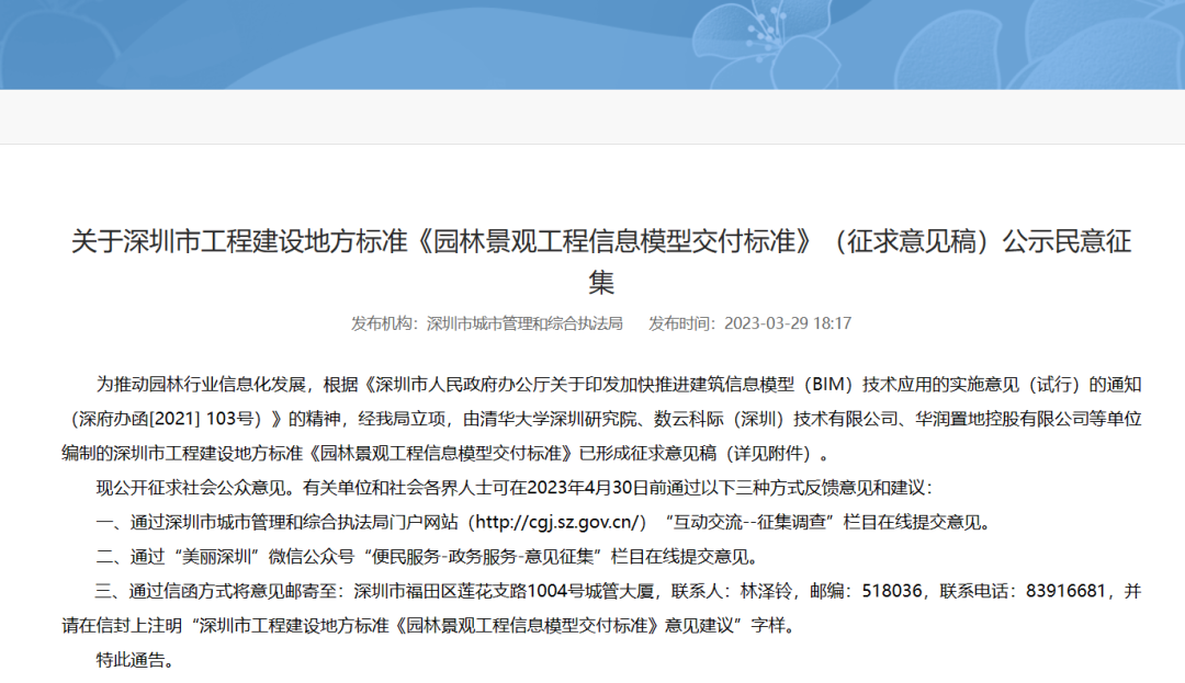 由深圳市住房和建設(shè)局、深圳市城市管理和綜合執(zhí)法局組織,同炎數(shù)智參編的深圳市工程建設(shè)地方標(biāo)準(zhǔn)《園林景觀工程信息模型交付標(biāo)準(zhǔn)》(以下簡稱為“標(biāo)準(zhǔn)”),已于2023年3月29日公示并進(jìn)行民意征集。