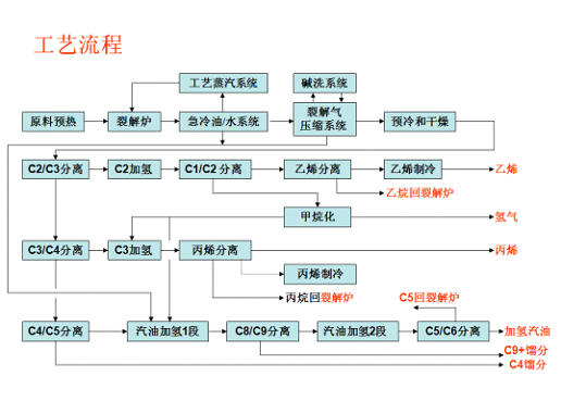 乙烯裝置利用煉廠直餾輕石腦油和直餾重石腦油(LVN/HVN)、加氫尾油(HVGO)、加氫裂化輕石腦油(HCN)、裂解汽油加氫裝置C5循環(huán)組分、來自于芳烴抽提裝置的C6提余油、煉廠飽和C3/C4液化氣、循環(huán)乙烷、循環(huán)丙烷等原料,通過高溫裂解,深冷分離產(chǎn)出主產(chǎn)品乙烯和丙烯以及其它付產(chǎn)品。乙烯、丙烯產(chǎn)品送至下游生產(chǎn)聚乙烯、聚丙烯產(chǎn)品。